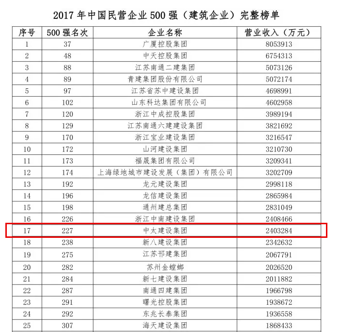 8月24日,由全國工商聯主辦,工信部、國家工商總局支持的2017中國民營企業500強榜單揭曉,中太建設集團連續7年躋身中國民營企業500強(第227位),位居全國民營建筑企業第17位。