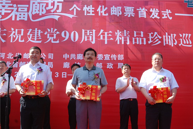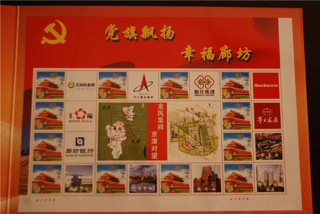 6月3日上午,由廊坊市委宣傳部與廊坊市郵政局共同推出的《黨旗飄揚 幸福廊坊》個性化郵票在廊坊市博物館舉行首發式!饵h旗飄揚·幸福廊坊》個性化郵票共“1+12”幅圖案。“1”即中心主圖案,體現廊坊市“龍鳳呈祥,京津對望”的區位優勢,“12”即12幅輔圖,其中4幅分別為會展中心、居民小區、文化藝術中心、中央生態城,體現“智能、生態、商務、休閑”的廊坊