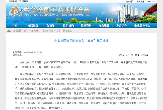 全國工商聯(lián)網(wǎng)站8月19日報(bào)道了中太建設(shè)集團(tuán)制定出臺(tái)“五好”員工標(biāo)準(zhǔn)