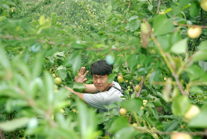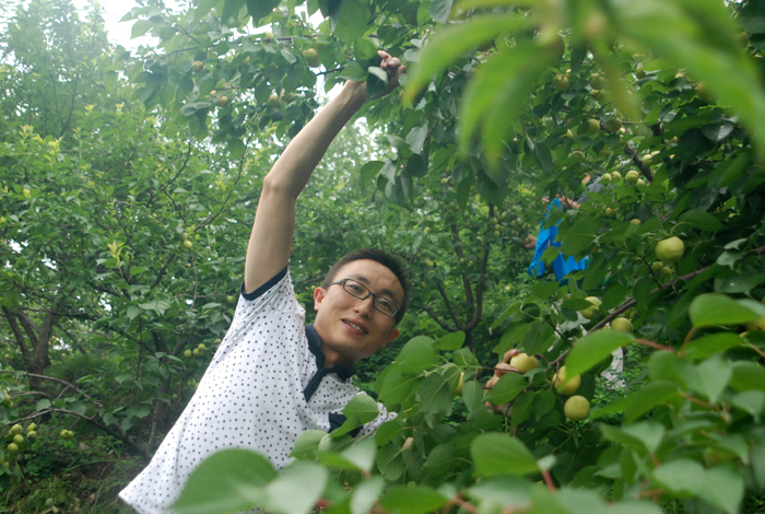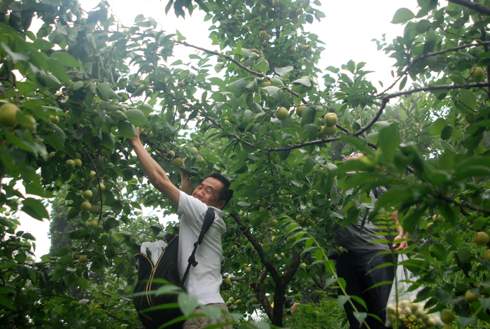 盡管空氣潮濕,路面濕滑,但阻擋不了大家采摘的熱情。面對(duì)著綴滿枝頭的杏兒,大家早就沒(méi)有平日里的文雅和羞澀,翹腳、彎枝,瞄準(zhǔn)了那大個(gè)地、泛著紅暈的京白杏兒,熟練地采摘。